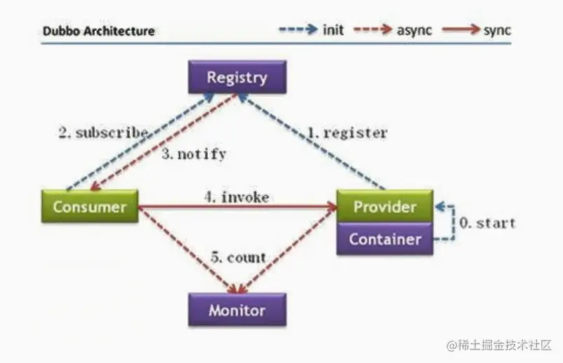 Provider:暴露服务的服务提供方 Container:服务运行容器 Consumer:调用服务的消费方 Registry:注册服务与发现服务中心 Monitor:统计服务调用的监控中心(可有可无)