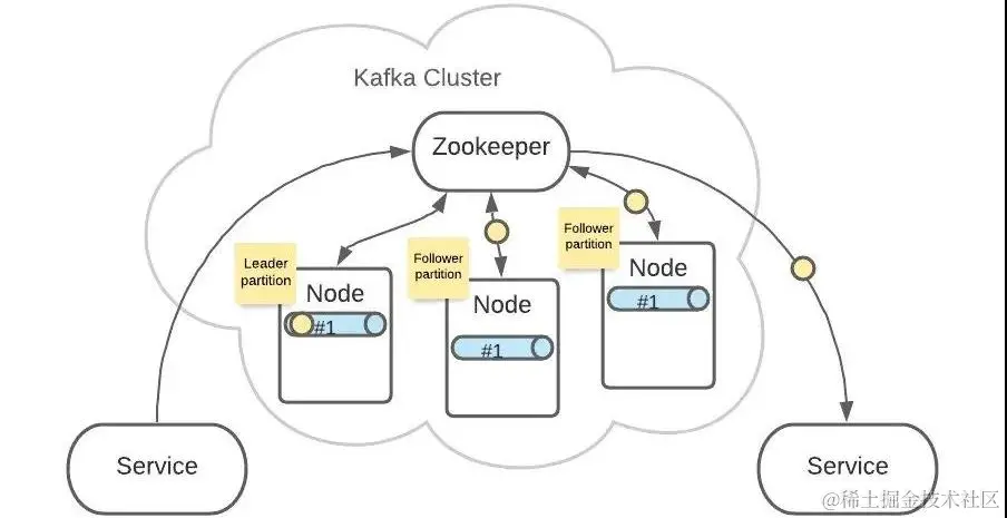 3个 Partition #1 中,ZooKeeper 会指定一个 Leader,负责接收生产者发来的消息。