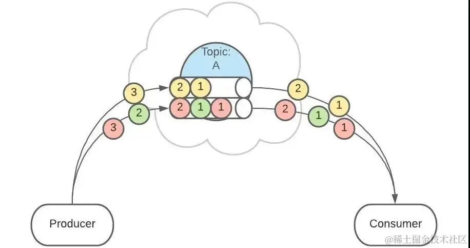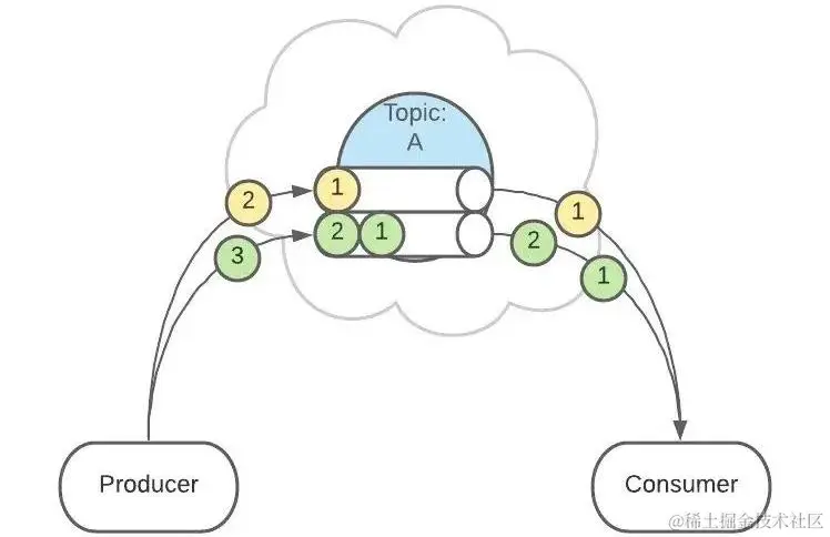 例如,用户1发送了3条消息:A、B、C,默认情况下,这3条消息是在不同的 Partition 中(如 P1、P2、P3)。