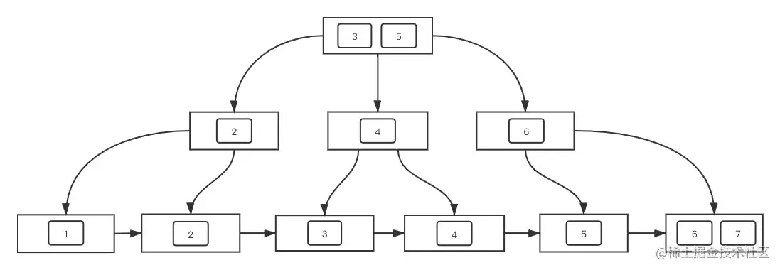 先给大家看看B+树到底长个什么鸟样,下图是一颗存储了数字「1-7」的B+树。