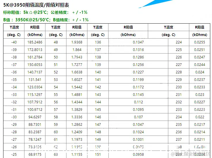 选用的是5K阻值的NTC热敏电阻,它的阻值和温度对照表如下: