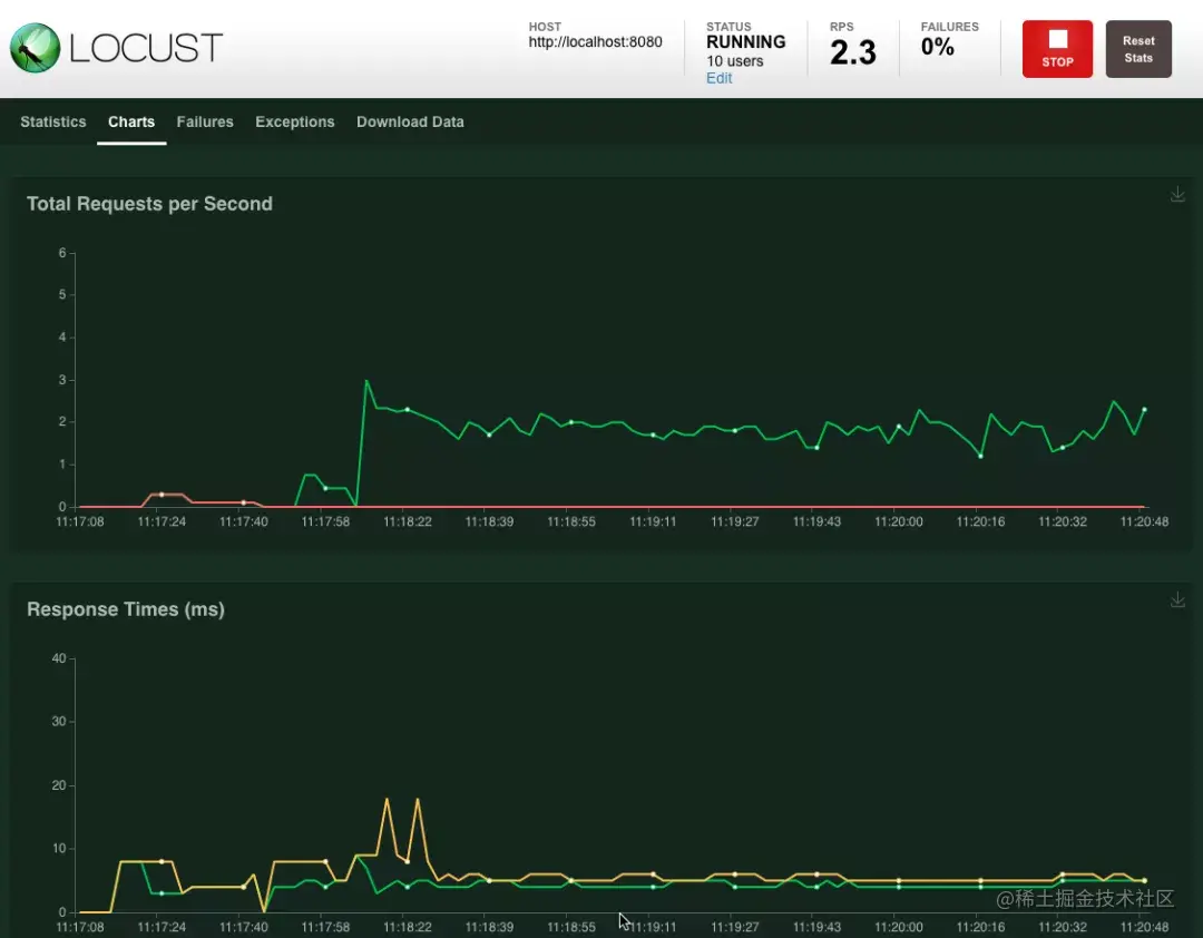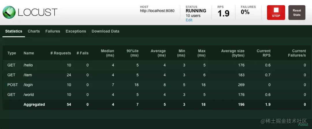 填写信息后,就能开始压测了。Web界面提供了结果统计数据: