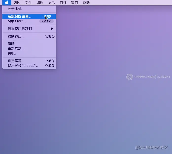 1.点击左上角的苹果图标,单击“系统偏好设置"。