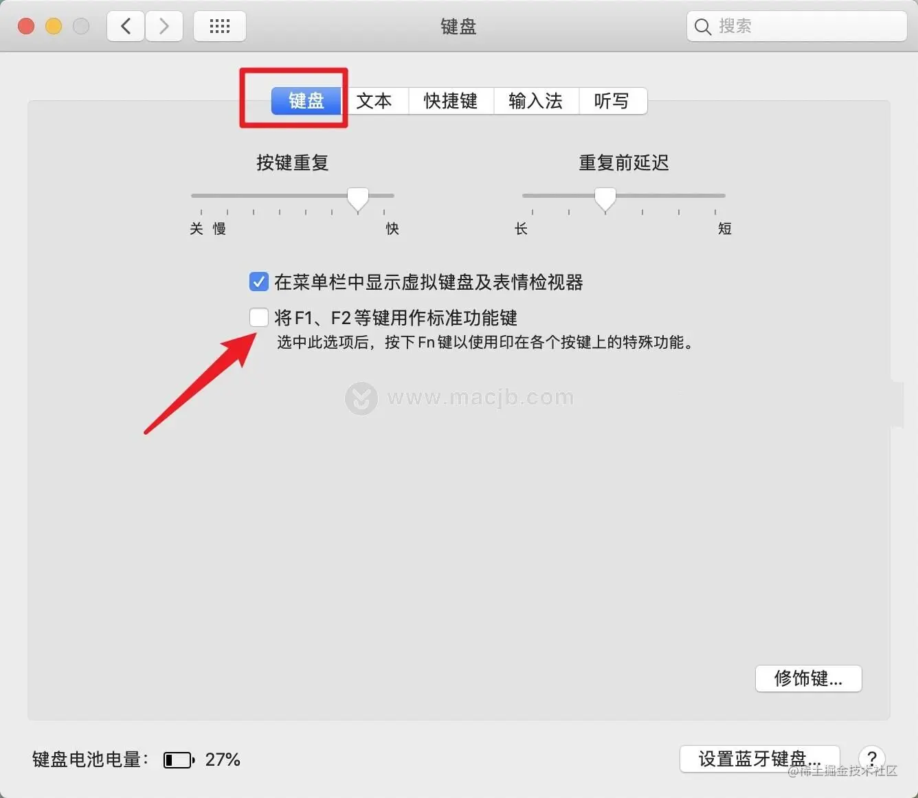 3.继续点击“键盘”选项,取消选中“将F1,F2等键用作标准功能键”的框,即可关闭fn功能。
