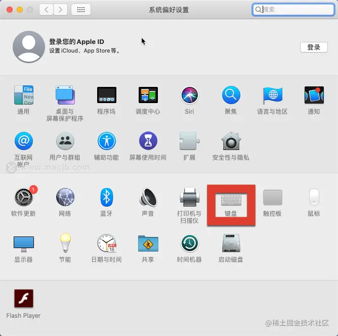 2.在系统偏好设置页面中,单击“键盘”选项。
