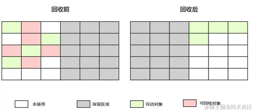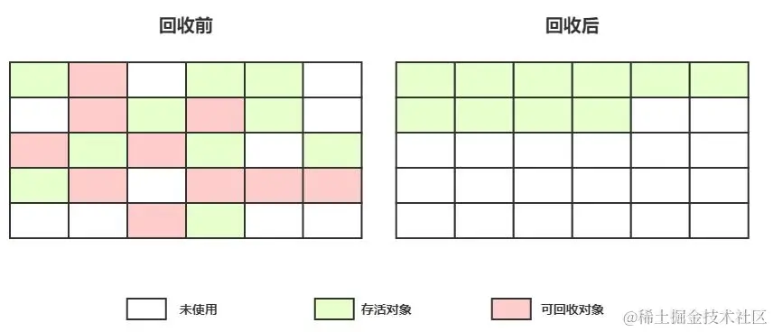 标记整理算法(Mark Compact),和标记清除类似,也有相同的标记过程,不过回收时并不是直接清除,而是让存活的对象都向一端移动,然后清除掉边界以外的内存。虽然整理的效率要低于直接清除,但是通常不会产生内存碎片。