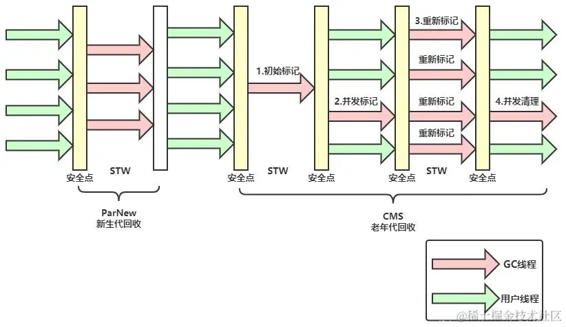 CMS(Concurrent Mark and Sweep)并发标记清除收集器,垃圾回收时有四个步骤