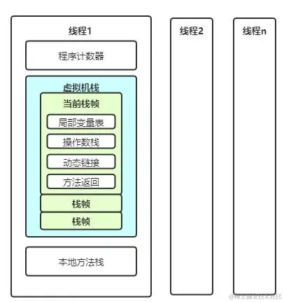 虚拟机中每个线程都有自己独有的虚拟机栈,该栈和线程同时创建,用于存储栈帧(Frame),每个方法被调用时会生成一个栈帧压栈,栈帧中存储了局部变量表、操作数栈、动态链接、方法返回地址