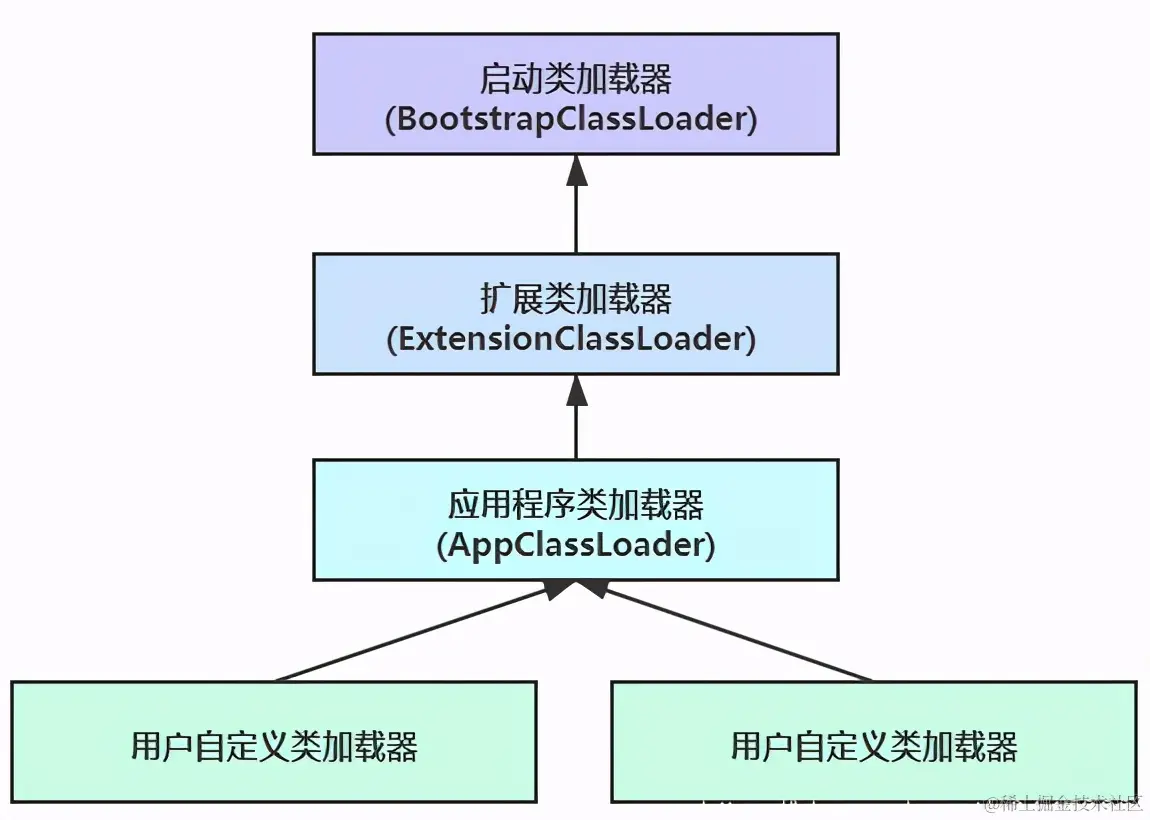 JVM中的ClassLoader除了启动类加载器外,其余的类加载器都应该有自己的父级加载器(如上图所示)。