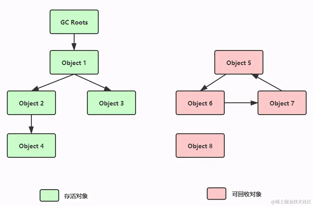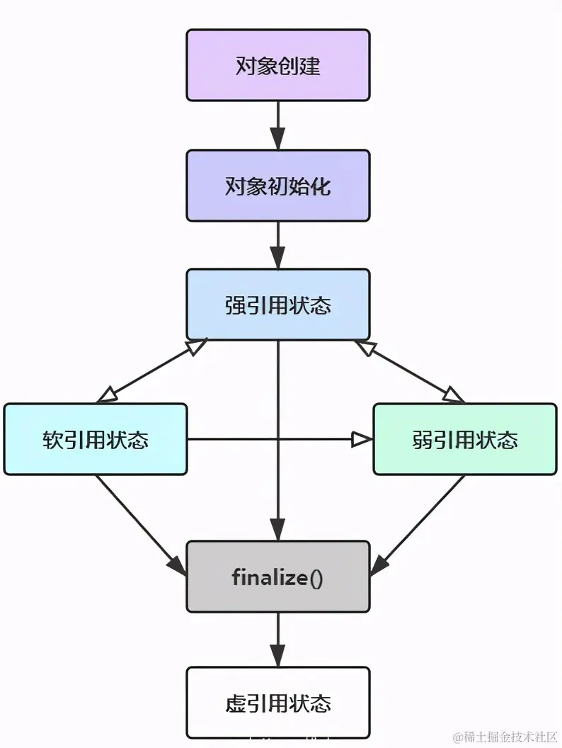 像Object a = new A()这样的普通对象引用,只要还有强引用指向一个对象,就表明对象还存活,不可被回收。对于一个对象,如果没有其他的引用关系,只要超过了作用域,或者将引用赋值为null,就表示可以回收,但是具体回收时机还是看垃圾回收策略。