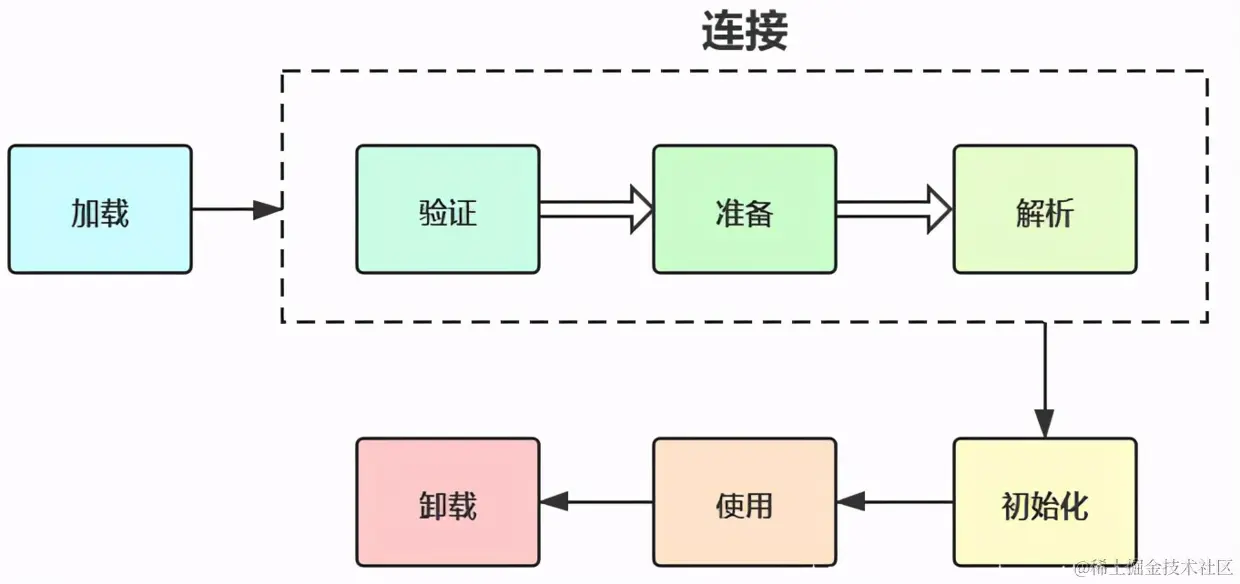 - 解析:把常量池中的符号引用转换成直接引用,让类能够直接引用到想要依赖的目标