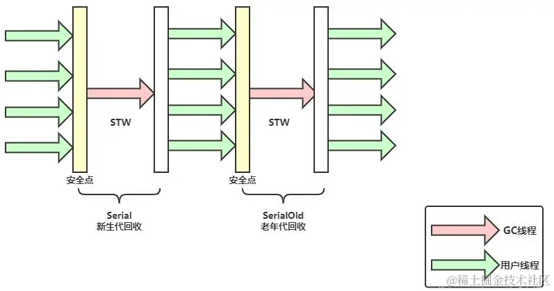 Serial(串行)收集器,是一个单线程收集器,特点是是简单高效,对于单CPU来说,没有多线程的切换交互的开销,可能会更高效,是默认的Client模式下的新生代收集器。