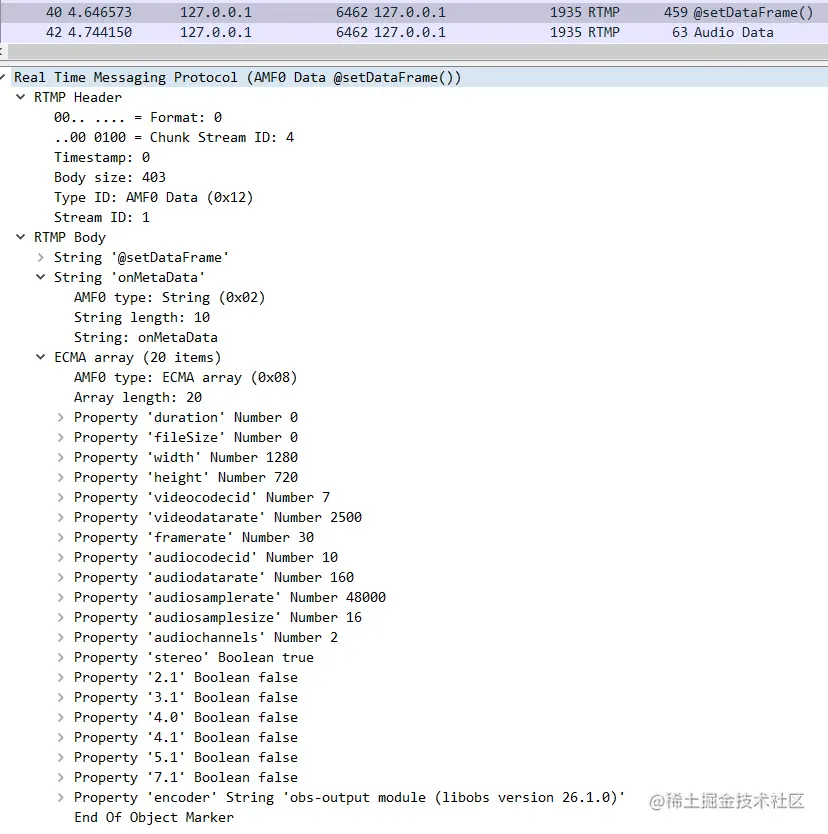 服务端会首先会检测这个频道名是否存在以及检查这个推流名是否被使用中,如果不存在或者在使用的话就会拒绝客户端的推流请求。由于我们在推流前已经生成了该频道名,客户端可以合法使用,于是服务端在38号包中回应的是 "NetStream.Publish.Start",也就是告诉客户端可以开始推流了。客户端在推流音视频数据前需要先把音视频的的元数据发给服务端,也就是40号包所做的事情,我们可以看一下该包的详细内容。从下图可以看出,发送元数据信息比较多,包含有视频分辨率,帧率,音频采样率和音频声道等关键信息。