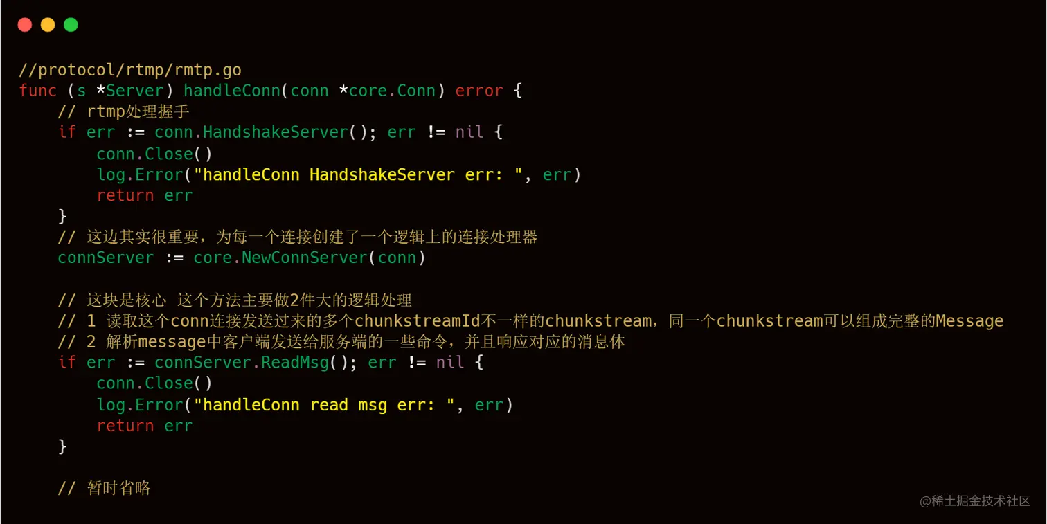 作为一个应用层协议解析来说,首先,我们要注意的就是主体流程的把握,对于每一个 RTMP 服务器来说,每一个推流和拉流从代码层面来说,都是一个网络链接,针对每一个连接,我们要进行对应的工序进行处理,我们可以看到livego中源码中所展示的一样,有一个handleConn方法,顾名思义,就是用来处理每一个连接,按照主流程来说,分为第一部分的握手,第二个核心模块的依据RTMP包协议,进行Chunk header和Chunk body的解析,后续再根据解析出来的Chunk header和Chunk body再做具体的处理。