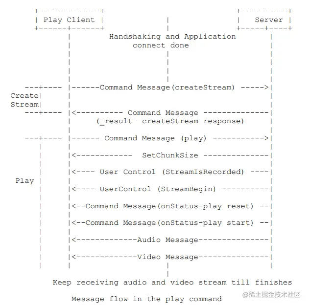 有了推流客户端的持续推流,拉流客户端就可以通过服务器持续拉取到音视频数据了。RTMP 协议规范的7.2.2.1节对拉流过程进行了详细描述。其中,握手、连接和创建流的过程前文已经讲述过了,我们重点关注下 play 命令的过程就行。