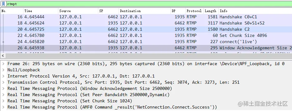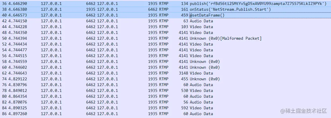 使用OBS推流到 livego 服务器中应用名为 live 的 movie 频道,推流地址为:rtmp://localhost:1935/live/rfBd56ti2SMtYvSgD5xAV0YU99zampta7Z7S575KLkIZ9PYk。同样,我们还是先看一下WireShark 的抓包内容吧。