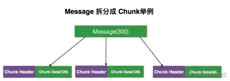 上图是一个简单例子,假设需要传递一个300字节长的Message,我们可以将其拆分成3个Chunk,每一个Chunk可以分成 Chunk Header 和 Chunk Data。在Chunk Header 里我们可以标记这个Chunk中的一些基本信息,如 Chunk Stream Id 和 Message Type;Chunk Data 就是原始信息,上图中将 Message 分成128+128+44 =300,这样就可以完整的传输这个Message了。