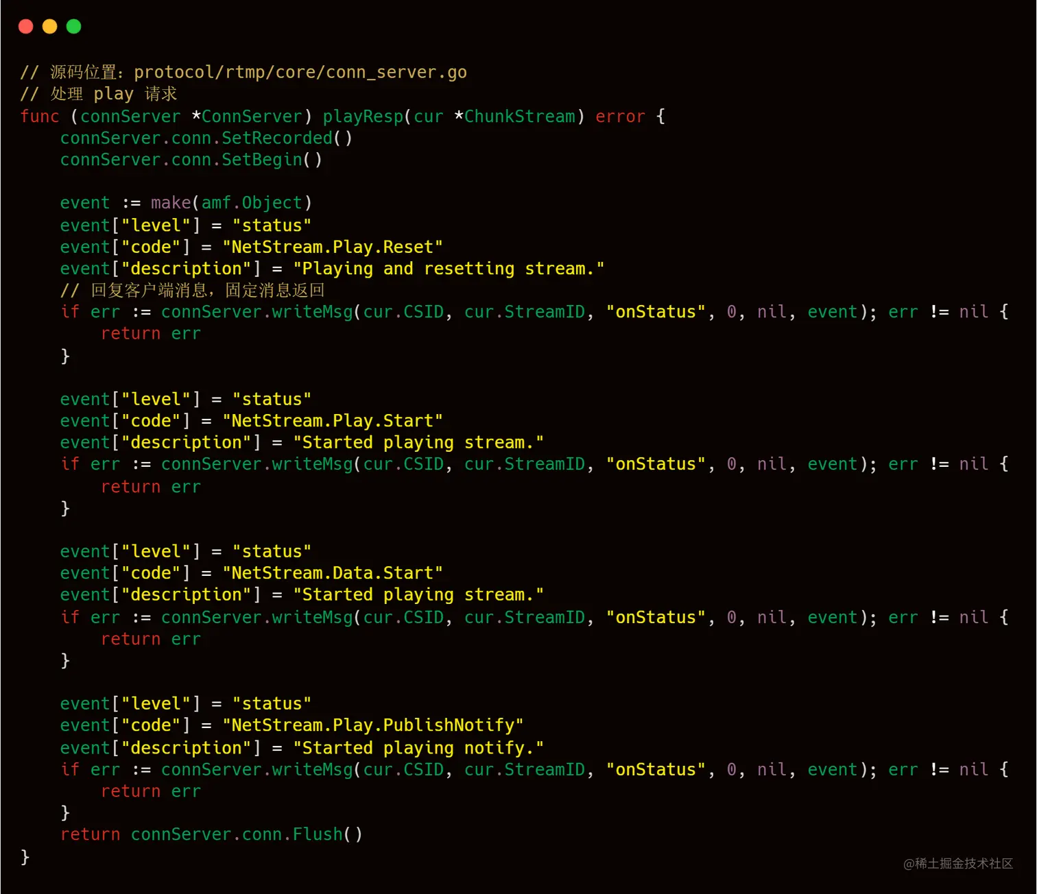 服务端收到拉流客户端的 play 请求后,会做出响应 "NetStream.Play.Reset","NetStream.Play.Start" ,"NetStream.Play.PublishNotify" 和音视频元数据。这些工作做完后,就可以持续发送音视频数据给拉流客户端了。我们可以通过 livego 源码来加深一下对此过程的理解。