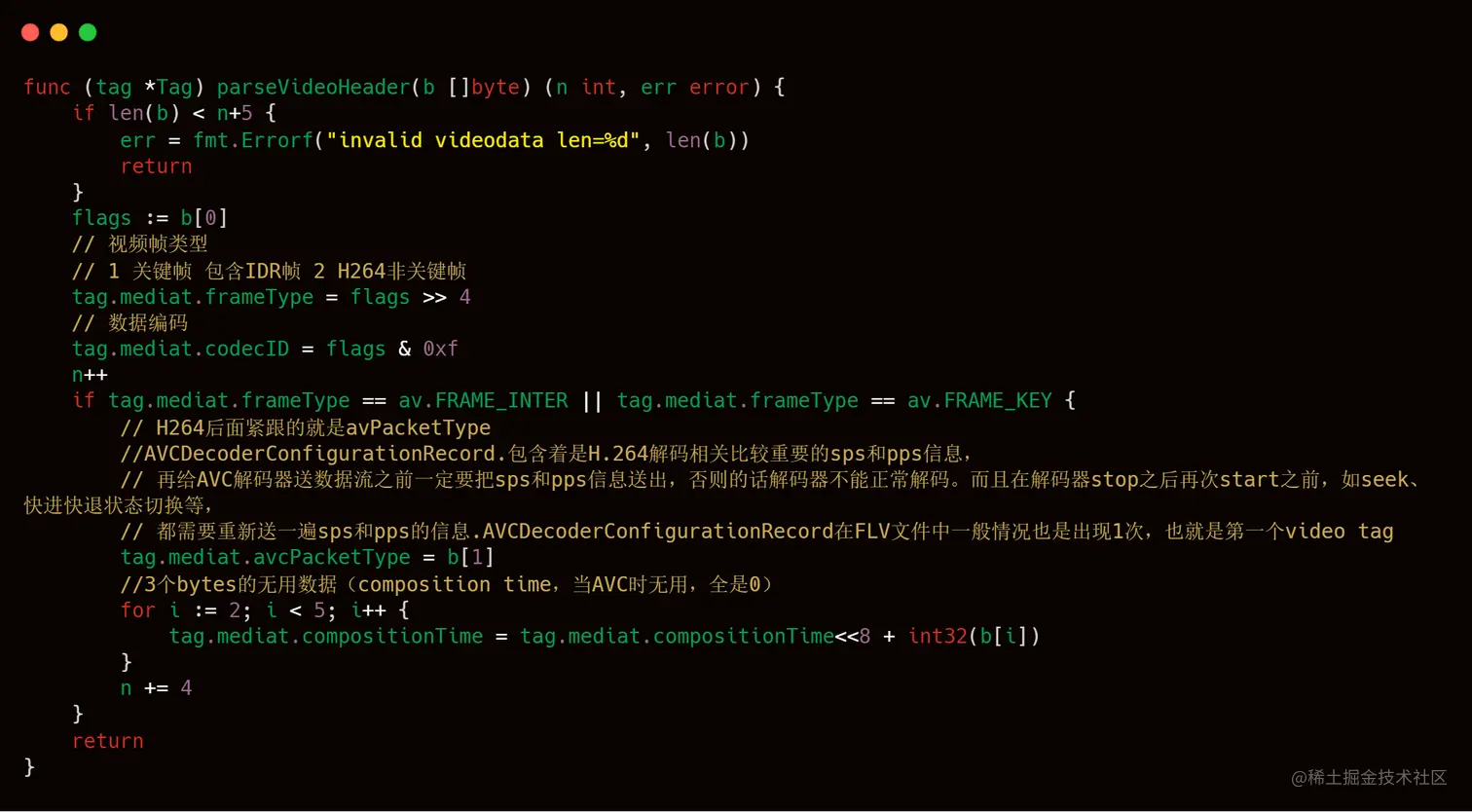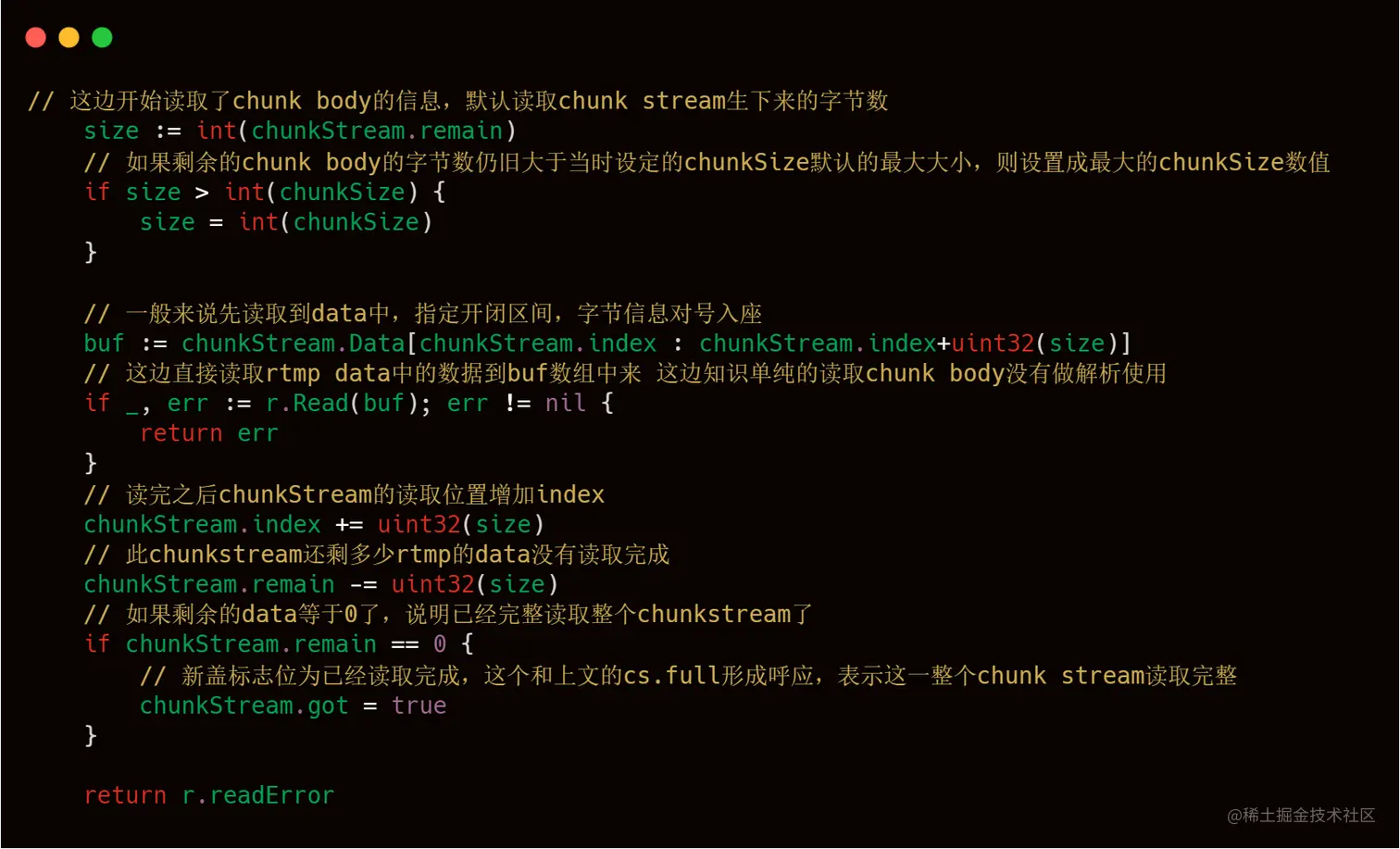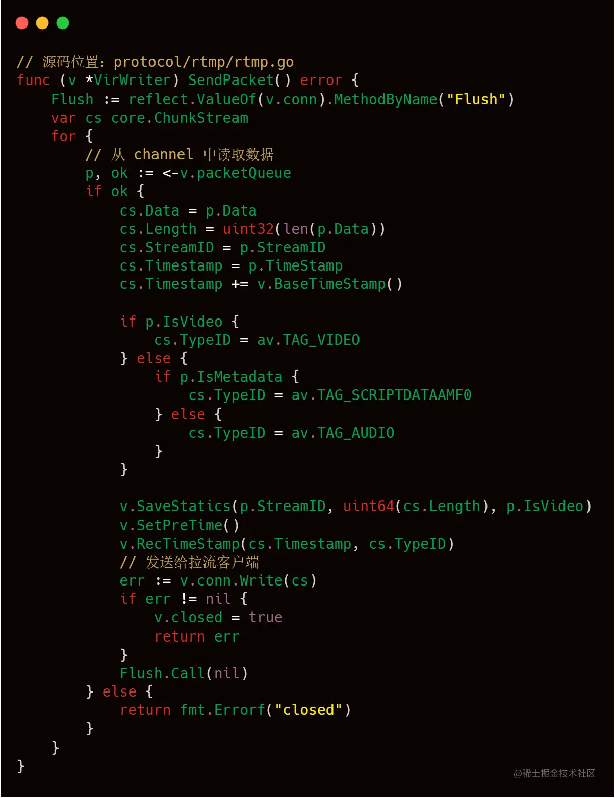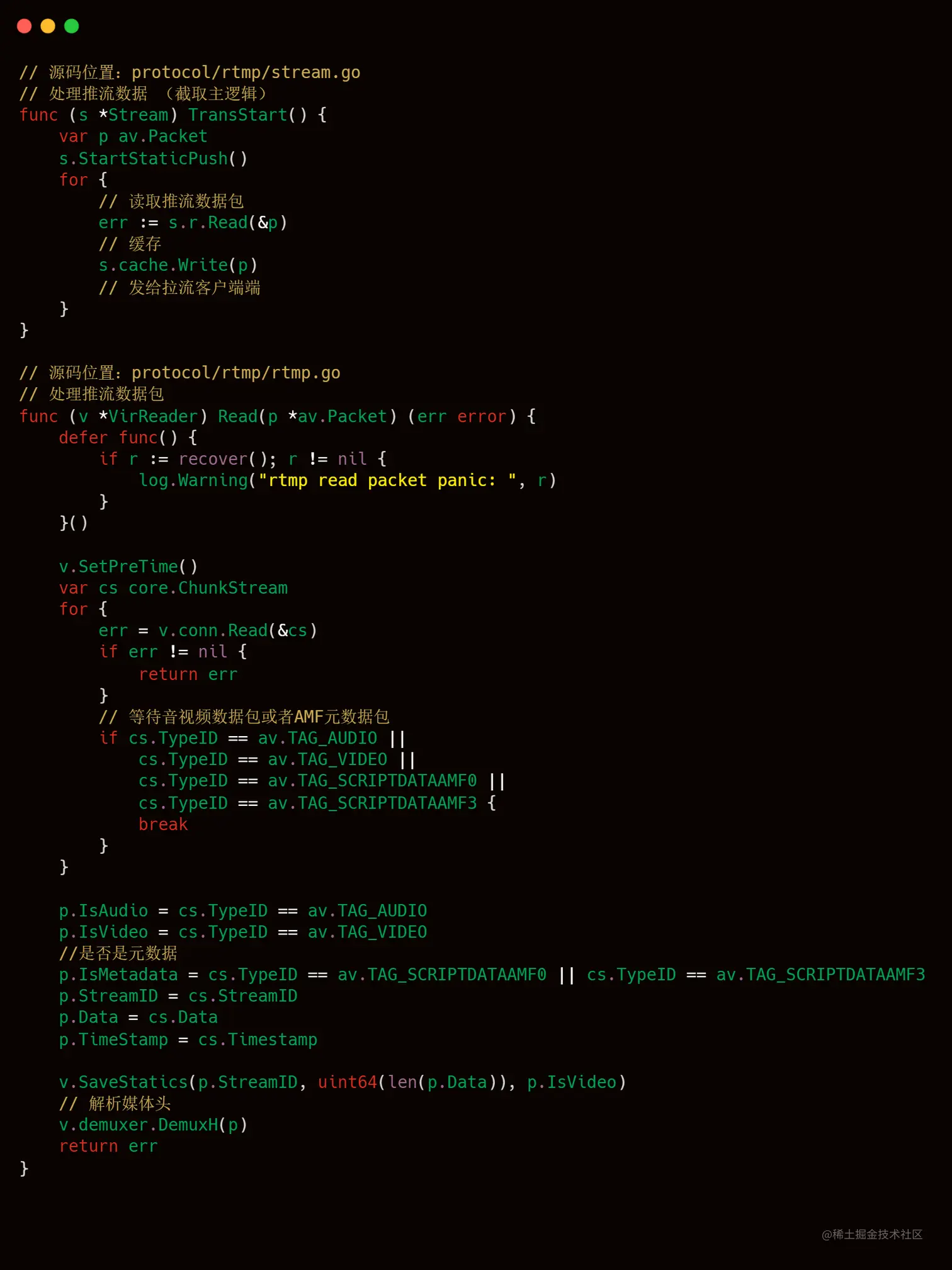 告诉服务端音视频元数据后,客户端就可以开始发送有效的音视频数据了,服务端会一直接收这些数据,直到客户端发出 FCUnpublish 和 deleteStream 命令为止。stream.go 的 TransStart() 方法主要逻辑为接收推流客户端的音视频数据,然后在本地缓存最新的一个数据包,最后将音视频数据发给各个拉流端。其中读取推流客户单音视频数据主要是使用到 rtmp.go 中的 VirReader.Read() 方法,相关代码和注释如下所示。