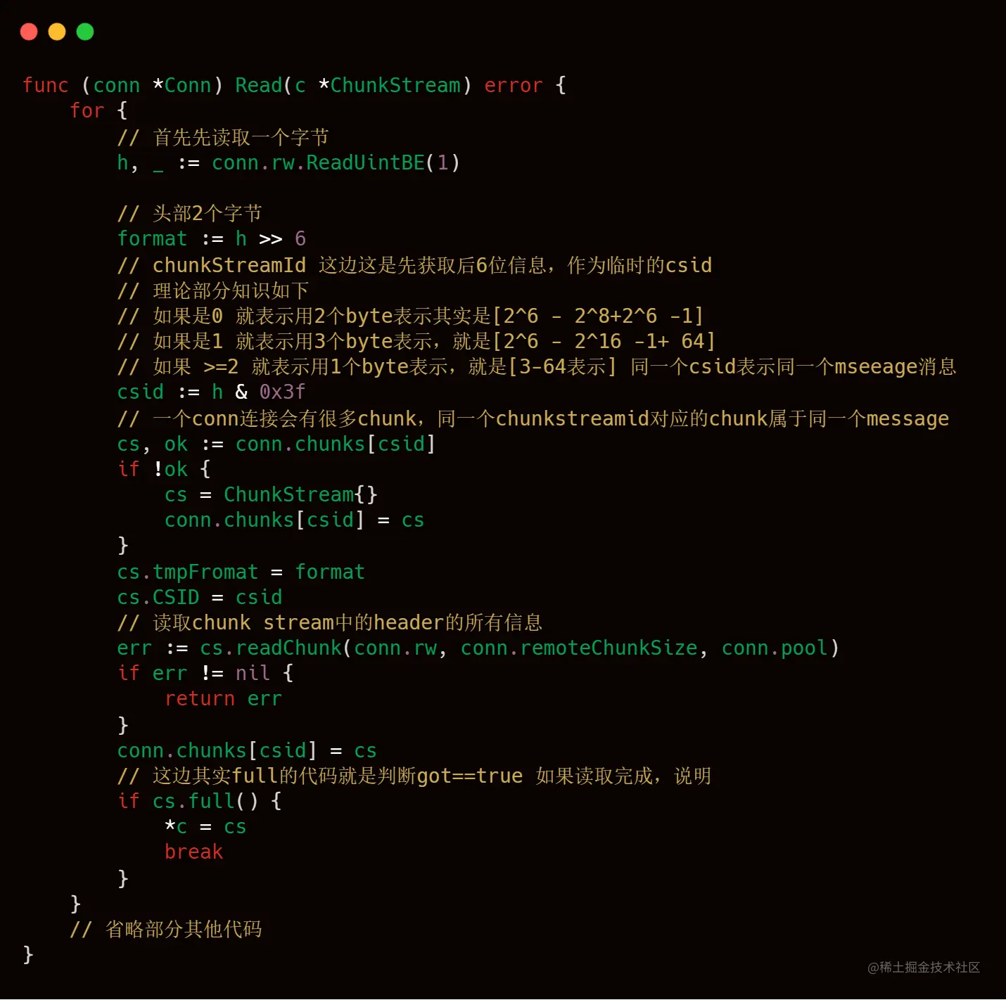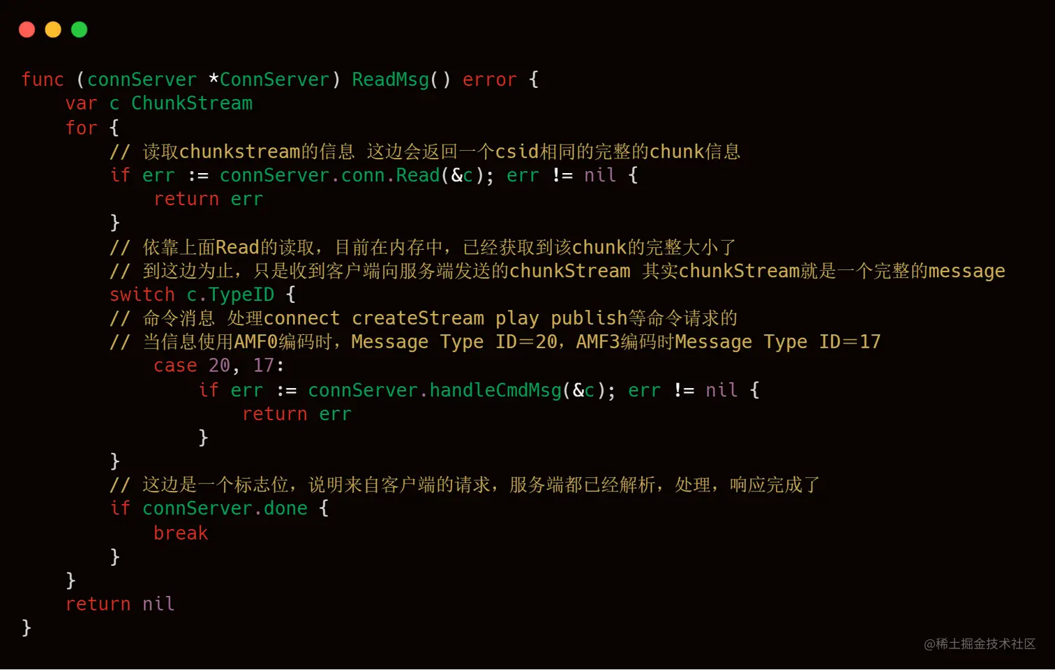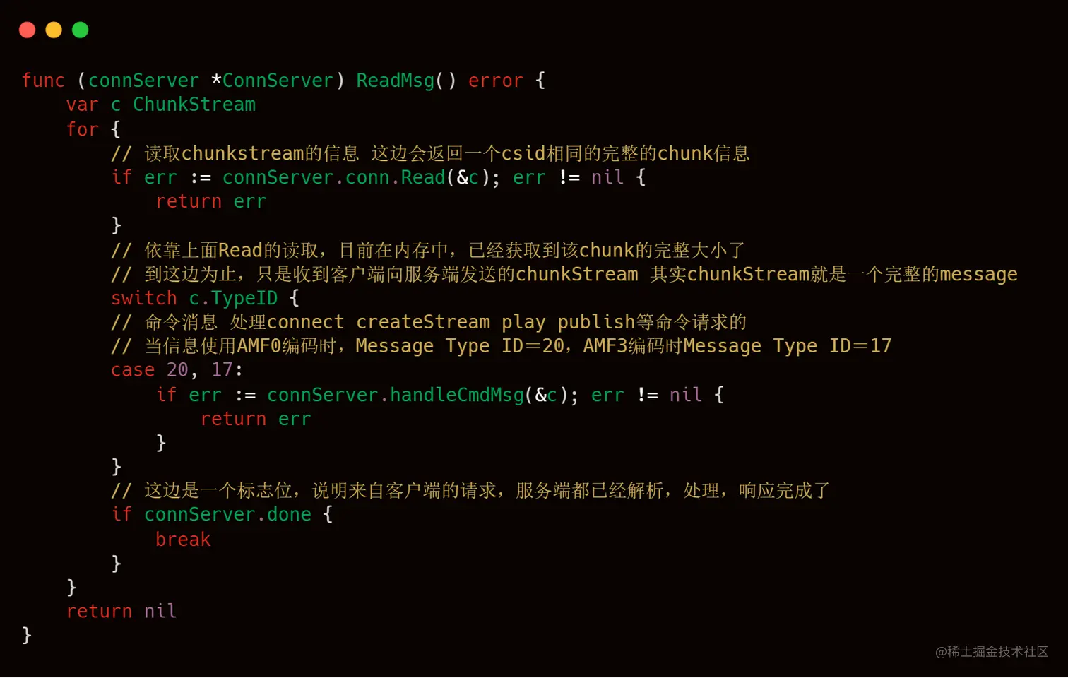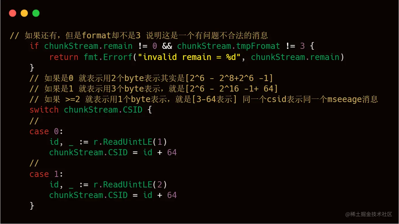 这块代码就是和我们之前理论部分知识介绍的chunkstreamId那块知识比较接近的地方了,大家可以结合起来一起看,大家在脑海中,要注意就是一个conn连接,会传递多个Message,例如连接Message,createStreamMessage等等,每一个Message就是Chunk Stream,也就是多个csid相同的Chunk,所以livego的作者使用map这样的数据结构进行存储,key就是csid,value就是chunkstream,这样就可以将向rtmp服务器发送过来的信息能够全部保存下来。