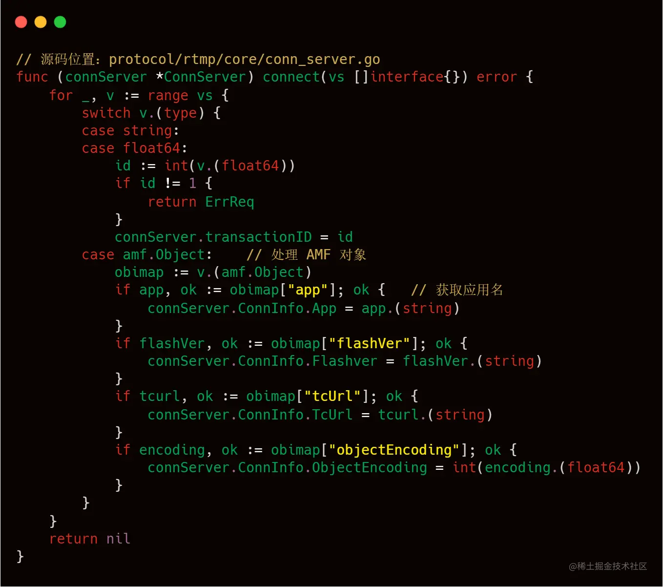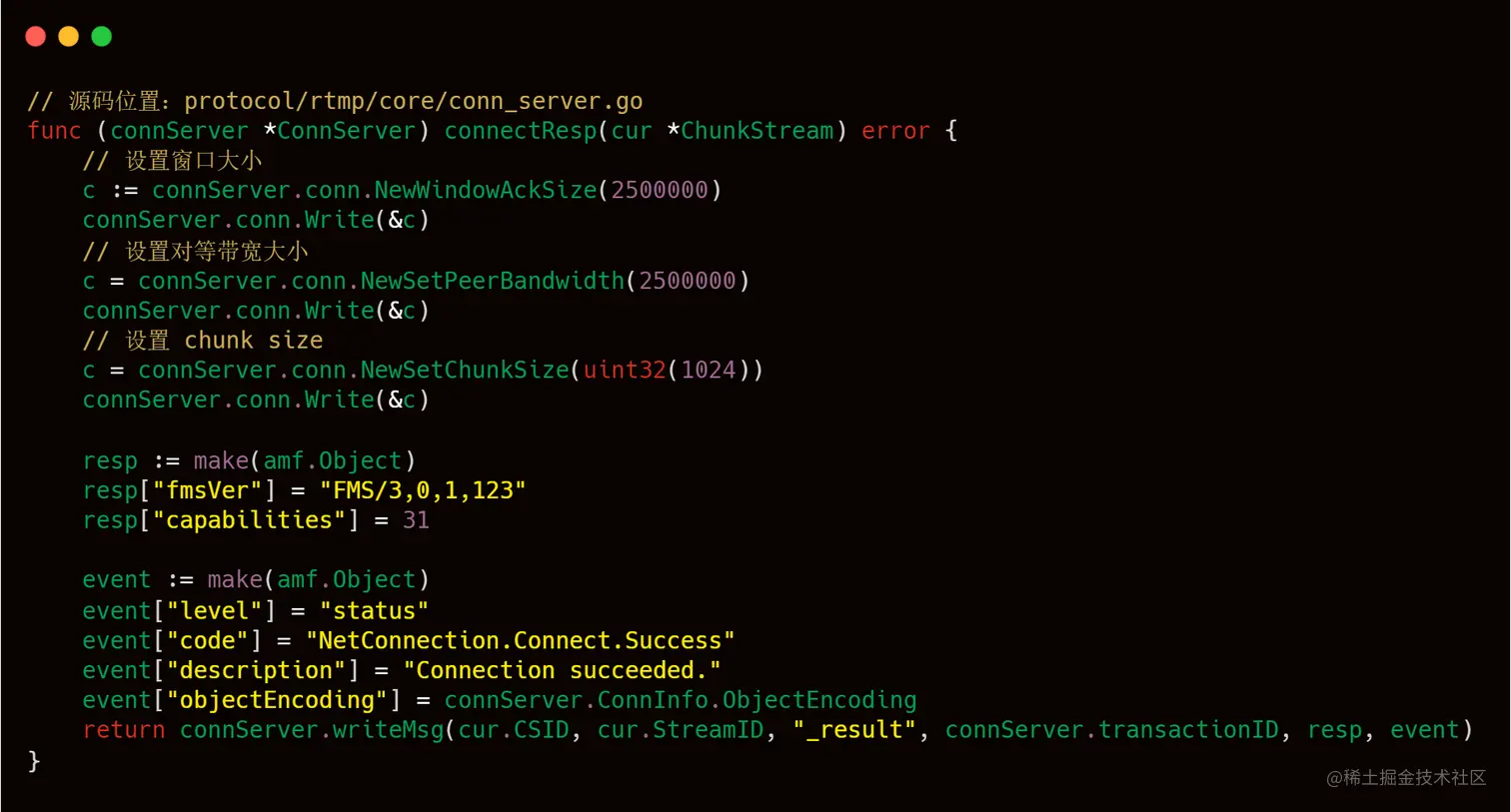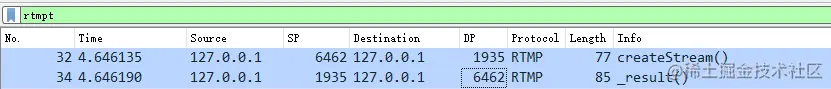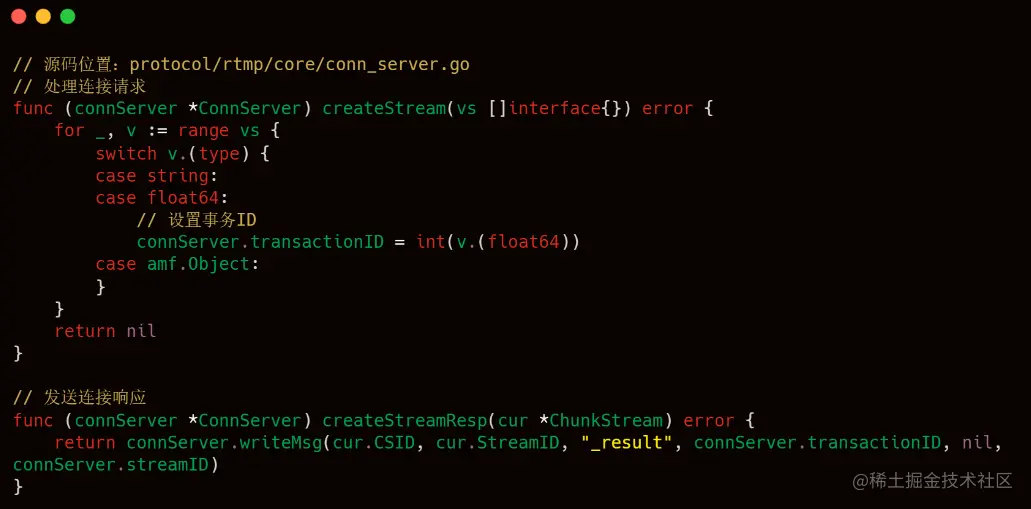 其中 32 号包是客户端发起 createStream 请求,34 号包是服务端响应,以下是 livego 处理客户端连接请求的源码。