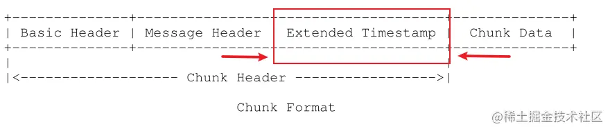 其中,timestamp 是绝对时间戳,表示的是这个消息发送的时间;message length 表示的是chunk body的长度;message type id 表示的是消息类型,这个在后文会具体讲到;message stream id 是消息唯一标识。这边需要注意的是,如果这个消息的绝对时间戳大于0xFFFFFF,说明这个时间大到无法用3个字节来表示,需要借助扩展时间戳(Extended Timestamp)来表示,扩展时间戳长度为4个字节,默认放在Chunk Header和Chunk Body之间。