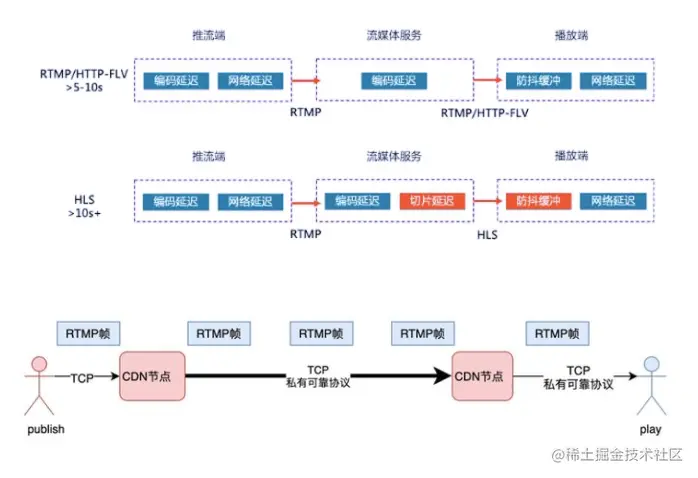 CDN链路延迟, 这分为两部分,一部分是网络传输延迟。CDN内部有四段网络传输,假设每段网络传输带来的延迟是20ms,那这四段延迟便是100ms;此外,使用RTMP帧为传输单位,意味着每个节点都要收满一帧之后才能启动向下游转发的流程;CDN为了提升并发性能,会有一定的优化发包策略,会增加部分延迟。在网络抖动的场景下,延迟就更加无法控制了,可靠传输协议下,一旦有网络抖动,后续的发送流程都将阻塞,需要等待前序包的重传。