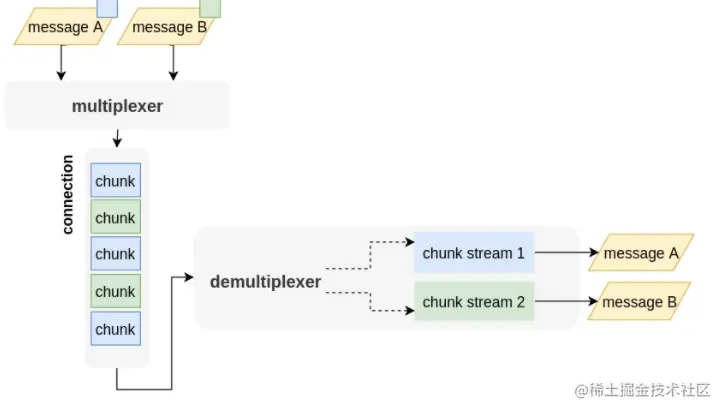 简而言之,就是在一个 TCP 连接上,将需要传递的Message分成一个或者多个 Chunk,同一个Message 的多个Chunk 组成 ChunkStream,在接收端,再把 ChunkStream 中一个个 Chunk 组合起来就可以还原成一个完整的 Message,这就是多路复用的基本理念。