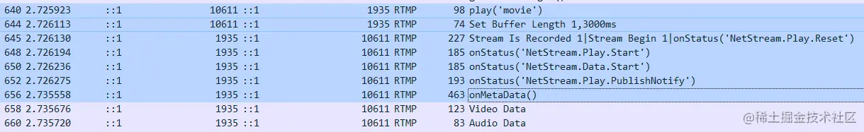 同样,我们先用 WireShark 抓包来分析下。客户端通过 640 号包告诉服务器,我想要播放叫 “movie” 的频道。