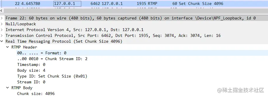 那么客户端和服务端是如何知道这些包的含义的呢?这就是 RTMP 协议规范所制定的规则了,我们可以通过阅读规范来了解,当然也可以通过 wrieshark 来帮助我们快速解析。以下是 22 号包的详细解析,我们重点关注 RTMP 协议解析信息就行。