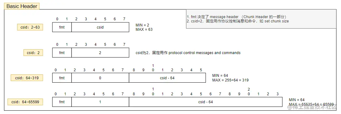 首先我们研究一下Chunk Header中Basic Header的部分,Basic Header的长度就是不固定的,可以是1个字节,2个字节或者3个字节,这取决于Chunk Stream Id(缩写:csid)。