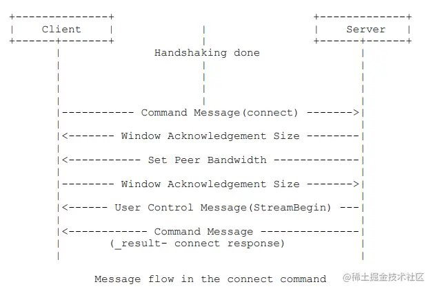 连接(Connect)命令处理过程:连接过程客户端和服务端会完成窗口大小,传输块大小和带宽大小的确认,RTMP 协议原文详细介绍了连接过程,如下图所示: