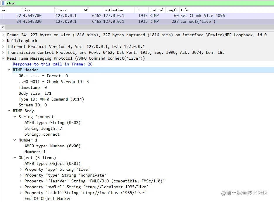 24 号包也是客户端发出的,可以看到它设置Message Stream ID 为 0,Message Type ID 为 0x14(即十进制的20),含义为 AMF0 命令。AMF0 属于 RTMP 命令消息(RTMP Command Messages),RTMP 协议规范并没有规定连接过程必须要使用的 Chunk Stream ID,因为真正起作用的是 Message Type ID,服务端根据 Message Type ID 来做相应的响应。连接过程发送的 AMF0 命令携带的是 Object 类型的数据,会告诉服务端要连接的应用名和播放地址等信息。
