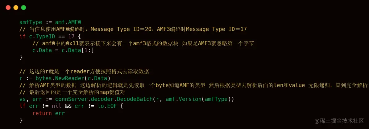 上述代码块中的handleCmdMsg中也是这个RTMP服务端处理客户端命令的代码精髓了,可以看出livego是支持AMF3和AMF0的,AMF3和AMF0的区别,上文也已经介绍过了,下文的代码注释写的也比较清楚,然后就是解析AMF格式的Chunk Body的数据,解析出来的结果也是按照Slice格式进行存储。