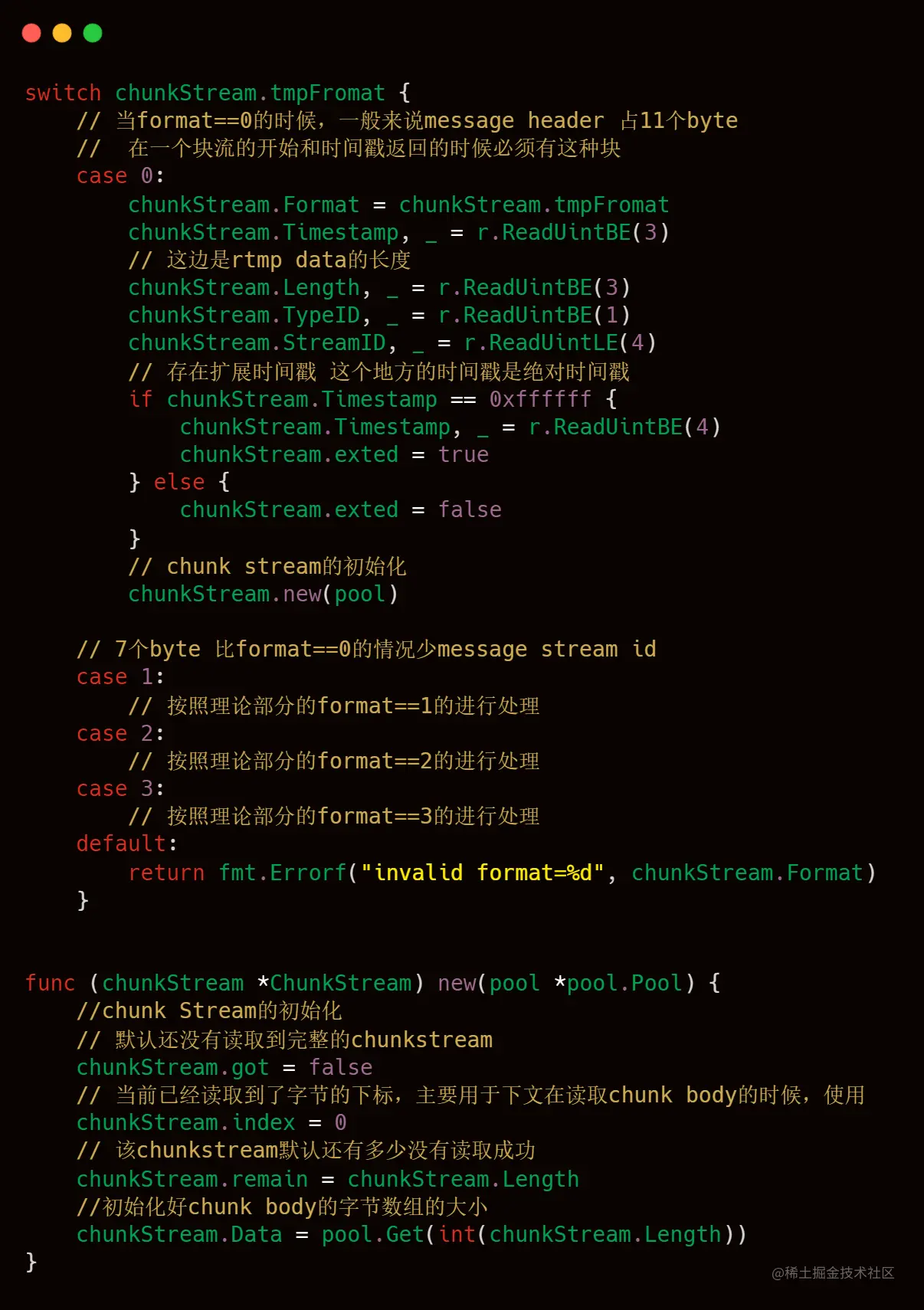 2)Chunk Header按照format的数值进行对应的解析处理,上文理论部分也已经介绍过了,下文也有具体的注释解释,有两个技术点需要注意第一就是timestramp时间戳的处理,第二个注意点是chunk.new(pool)这行代码,也是需要大家注意,代码注释中也写的比较清楚。
