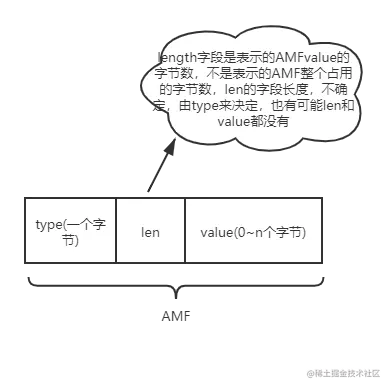 AMF具体的格式其实与Map的数据结构很相似,就是在KV键值对的基础上,中间多加了一个Value值的length。AMF的结果基本如下图所示,有时候len字段就是空,这个是由type来决定的,我们举例来说,例如我们传输的是number类型的AMF格式的数据,那么len字段我们就可以忽略,因为我们默认number类型的字段占用8个字节,我们这边就可以忽略了。