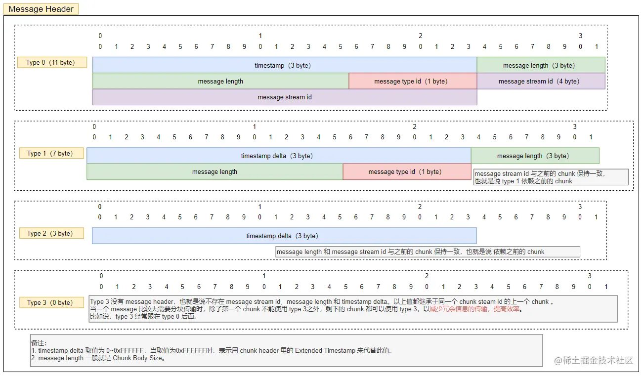 当 fmt 为 0 的时候,Message Header占用11个字节(请注意,这边的11个字节不包括Basic Header的长度),由3个字节长度的timestamp,3个字节长度的message length,1个字节长度的message type Id,4个字节长度的message stream Id所组成的。