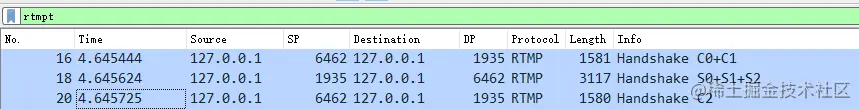 WireShark 抓包的 Info 能够为我们解读 RTMP 包的含义,从下图可以看出,握手主要涉及到3个包。其中第16号包是客户端向服务端发送 C0 和 C1 消息,18号包是服务端向客户端发送 S0,S1 和 S2 消息,20号包是客户端向服务端发送 C2 消息。如此,客户端和服务端就完成了握手过程。