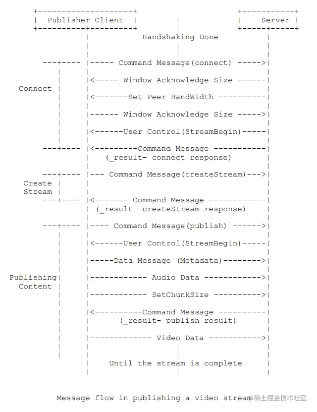 创建流完成后,就可以开始推流或者拉流了,RTMP 协议规范的7.3.1节也有给出推流示意图,如下图所示。其中连接和创建流的过程上文已经详细介绍过了,我们重点看发布内容(Publishing Content)的过程就行。