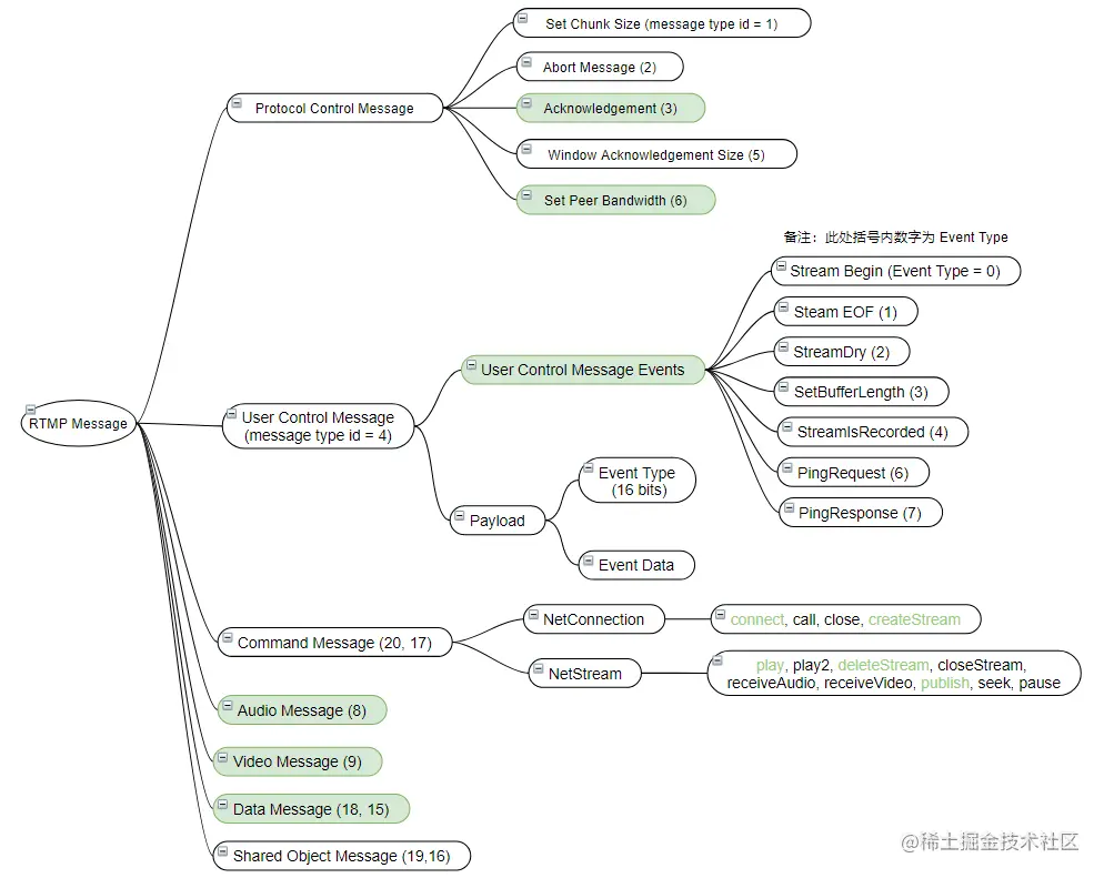 命令消息 Command Message (20, 17):此类型消息主要有 NetConnection 和 NetStream 两类,两类分别有多个函数,该消息的调用,可理解为远程函数调用。