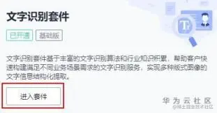 1、在 ModelArts Pro 控制台界面,单击“文字识别”套件卡片的“进入套件”。