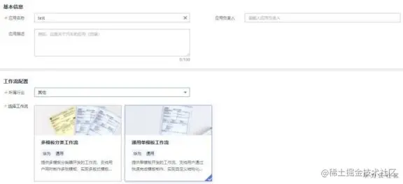 4、根据业务需求填写“应用名称”、“应用负责人”和“应用描述”,选择“所属行业”及工作流。