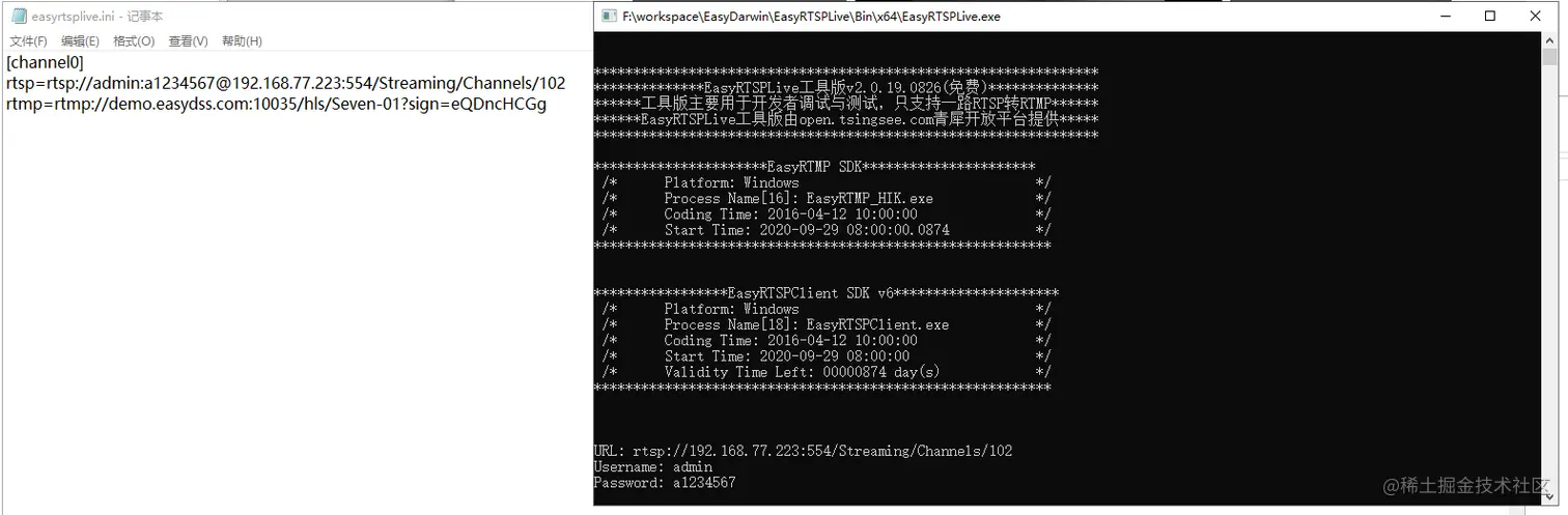 为证实我们的预判,我们用EasyRTSPLive再做一个实验,EasyRTSPLive是基于LIVE555改造的一个拉转推工具,配置很简单,拿到程序包解压后有个ini配置文件,直接配置RTSP源和RTMP目的地址,然后就可以启动程序。