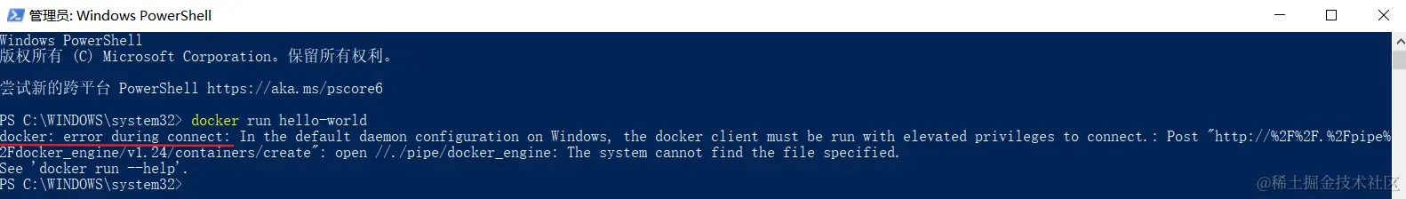 In the default daemon configuration on Windows, the docker client must be run with elevated privileges to connect.