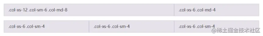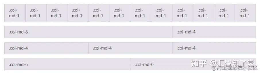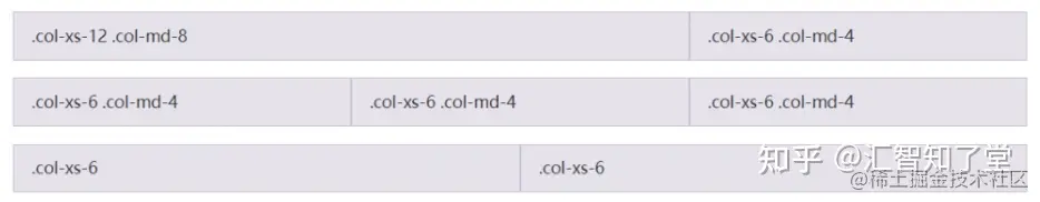 - 栅格系统中的列是通过指定1到12的值来表示其跨越的范围。例如,三个等宽的列可以使用三个