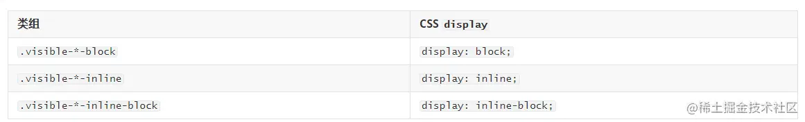 从 v3.2.0 版本起,形如 .visible-*-* 的类针对每种屏幕大小都有了三种变体,每个针对 CSS 中不同的 display 属性,列表如下: