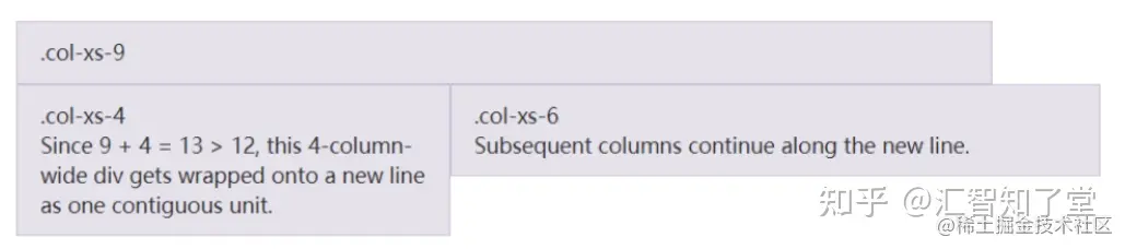 <div class="col-xs-4">.col-xs-4<br>Since 9 + 4 = 13 > 12, this 4-column-wide div gets wrapped onto a new line as one contiguous unit.</div>