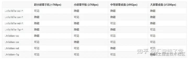.visible-xs、.visible-sm、.visible-md 和 .visible-lg 类也同时存在。但是从 v3.2.0 版本开始不再建议使用。除了 ` 相关的元素的特殊情况外,它们与.visible-*-block` 大体相同。