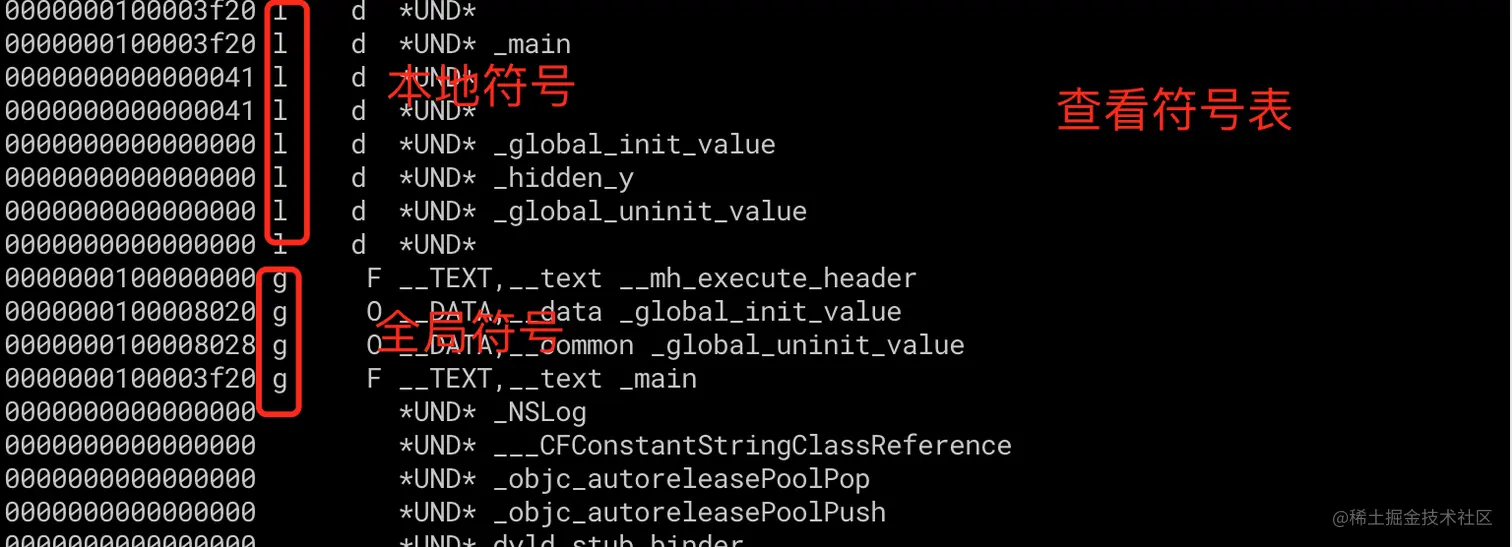 Symbol Table:就是用来保存符号。String Table:就是用来保存符号的名称。Indirect Symbol Table:间接符号表。保存使用的外部符号。更准确一点就是使用的外部动态库的符号。是Symbol Table的子集。
