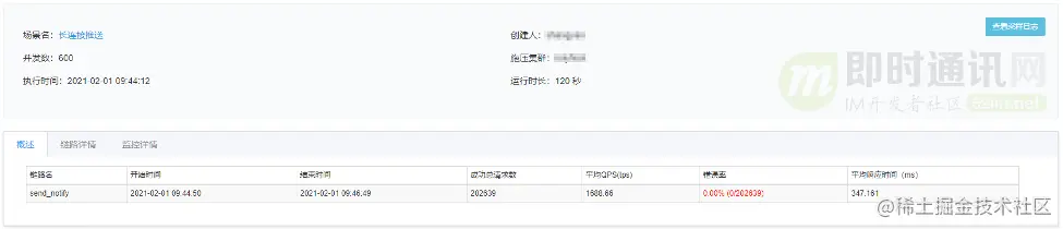 一般同一用户同时建立的长连接都在个位数。以10个长连接为例,在并发数600、持续时间120s条件下压测,推送接口的TPS大约在1600+,如下图所示。